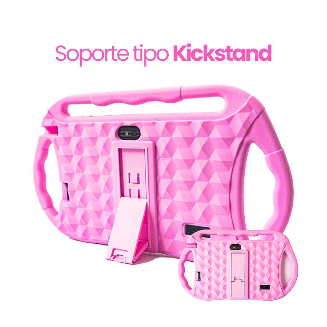 Incluye funda de silicona antideslizante con soporte trasero tipo “Kickstand” , ideal para apoyar la tableta sobre una mesa y usarla sin manos.